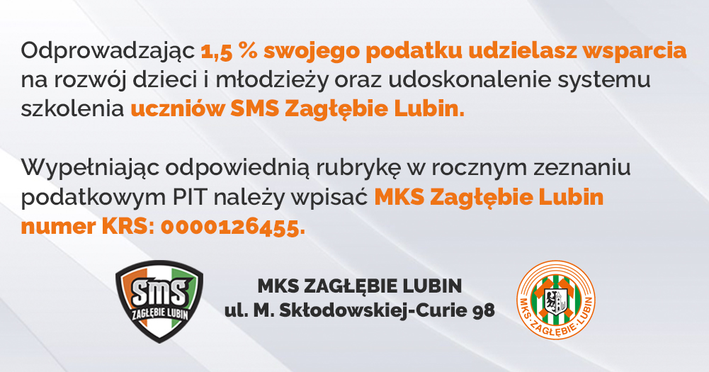Odprowadzając 1,5% swojego podatku udzielasz wsparcia na rozwój dzieci i młodzieży oraz udoskonalenie systemu szkolenia młodych uczniów SMS Zagłębie Lubin.